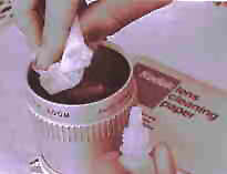Mientras frote, voltée o enrolle el pañuelo ligeramente para que ninguna partícula sea nuevamente frotada en la superficie del lente. Nunca aplique el limpiador directamente sobre el lente. Puede filtrarse fácilmente entre los elementos del lente creando un problema mayor. Y tampoco limpie un lente con pañuelos tratados con silicona ni el paño impregnado de silicona comúnmente vendido para limpiar anteojos. El residuo puede decolorar permantentemente el recubrimiento.