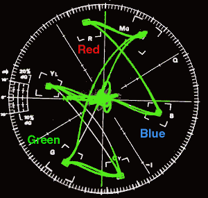 el vectorscopio también muestra la amplitud o saturación de cada color. La saturación