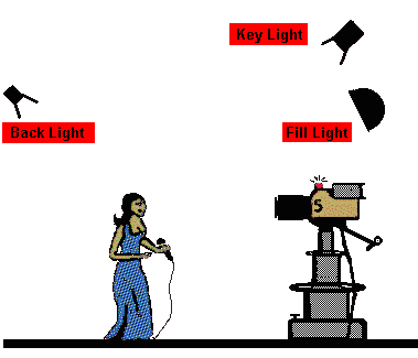 En producciones con varias cámaras, tendrá que convenir con el director durante la fase de ubicación de cámara en pre-producción, cuáles cámaras estarán tomando la mayoría de los close-up de cada persona. Recuerde, usted ilumina para los ángulos close-up. Una cosa que usted no quiere hacer es tener "luces por todas partes" en un esfuerzo frenético para cubrir cada ángulo concebible de la cámara. En un estudio donde hay múltiples áreas para iluminar, si usted no tiene cuidado puede terminar con demasiadas luces, y la iluminación de tres puntos que ilumina a un objeto terminará siendo de veinte puntos--y será además una iluminación muy pobre. No es extraño que un gran set en una escena dramática requiera más de 100 luces. A menos que la iluminación básica de tres puntos sea mantenida en las posiciones del talento, las cosas terminan enredándose, lo cual nos trae a otra pauta de la iluminación: Mientras más simple el diseño, mejor el efecto. Entre otras cosas, la luz de modelaje crea un destello en los ojos--La reflexión espectral en cada ojo que da una especie de "chispa" en los ojos. Vea el efecto del destello al principio de esta sección en la fotografía del modelo. Cuando usted coloca "luces por todas partes" no solamente produce una multitud de destellos en ojos, sino además produce un efecto plano, de iluminación sin vida. Muchas luces dirigidas a las áreas del talento crean una multitud confusa de sombras. Las viseras y las banderas pueden ser de gran ayuda para bloquear la luz de ciertas áreas. En producciones de una sola cámara, las cosas son mucho más fáciles porque hay sólo una cámara y un ángulo de cámara del que preocuparse.