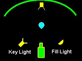 Aunque el ángulo vertical para la luz de modelaje debe ser de alrededor de 45 grados, la posición horizontal de la de luz de relleno es menos crítica. Generalmente, el relleno se ubica apenas más arriba que la cámara así que termina quedando ligeramente por debajo del modelaje. Desde allí puede hacer bien su trabajo: rellenar parcialmente las sombras creadas por la luz de modelaje.