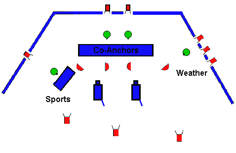 Un set de noticias, de pronósticos climatológicos y de noticias deportivas se muestra arriba. Hay que notar que al panear de un lado a otro, cualquiera de las cámaras puede tomar una de los dos presentadores principales, o los de deportes, o el clima. También se observa que la posición de la luz de modelaje y las de relleno tienen una cobertura de fórmula de 3 puntos para estas posiciones de cámara. |