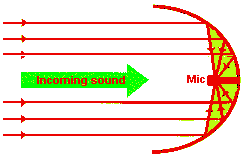 reflector El reflector parabólico puede ser de 1 a 3 piés de diametro. Debido a la forma parabólica del reflector todos los sonidos registrados en un ángulo muy estrecho de captación serán dirigidos hacia el micrófono. Los micrófonos parabólicos