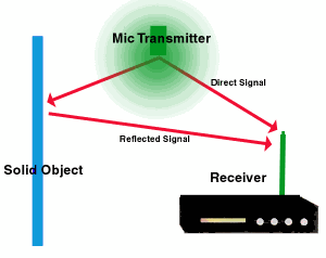 Antenas receptoras Una buena señal de micrófono RF tendría poco valor si no puede ser recibida sin recepción múltiple o cualquier tipo de interferencia. Una de las maneras mas efectivas de eliminar la interferencia es colocando adecuadamente la antena (o antenas) receptora. Existen dos tipos de receptores para inalámbricos. El receptor único usa una sola antena montada en la parte trasera del receptor. Este tipo de receptor es mas propenso a problemas de recepción -- especialmente cuando el talento se encuentra en movimiento. En los receptores duales se utilizan dos antenas. Ya que estas pueden ser colocadas a cierta distancia entre ellas, se asume que en el momento en que alguna antena no está recibiendo adecuadamente la señal la otra antena si lo haría. Para evitar que ambas antenas interfieran entre sí, circuitos electrónicos trabajan constantemente en el interior del receptor para seleccionar instantáneamente la mas clara y fuerte de las dos señales.