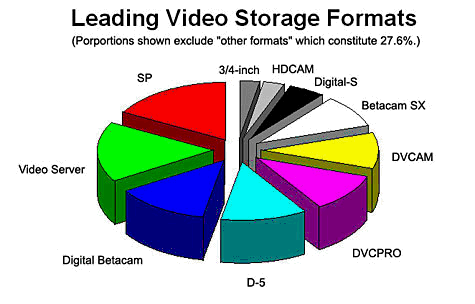excede todos los D-9 utiliza el diseño básico de transportación de VHS, aunque ha sido alterado (junto con la cinta y el cuerpo del cassette) para ajustarse a estándares profesionales. Aunque muchas maquinas D-9 son capaces de reproducir cintas S-VHS, el formato es muy superior al S-VHS, especialmente cuando se requieren aplicaciones multigeneracionales como la edición. (La copia de una copia es la primer generación, otra copia de esa copia es la segunda, etc.) Una característica importante de este formato es la pre-lectura, que permite reproducir video y audio y simultáneamente grabar nuevas señales de video y audio en su lugar. Esto significa que la señal original puede ser modificada varias veces antes de ser re-grabada. Por ejemplo, títulos y efectos especiales pueden ser adicionados mientras la cinta es reproducida. La siguiente gráfica enumera los formatos de uso actual. ("tracks" se refiere al numero de pistas de audio. Algunos grabadores no usan todas las pistas y algunas versiones de formato DV son capaces de grabar cuatro pistas de audio.)
