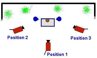 o simplemente introducir variedad visual. El siguiente paso, hacemos una toma de la escena completa desde la posición #2. Desde allí, podemos hacer planos sobre el hombro o close ups. Finalmente hacemos lo mismo con la cámara en la posición #3. Como nota complementaria en esta